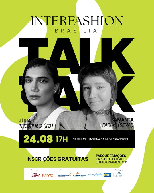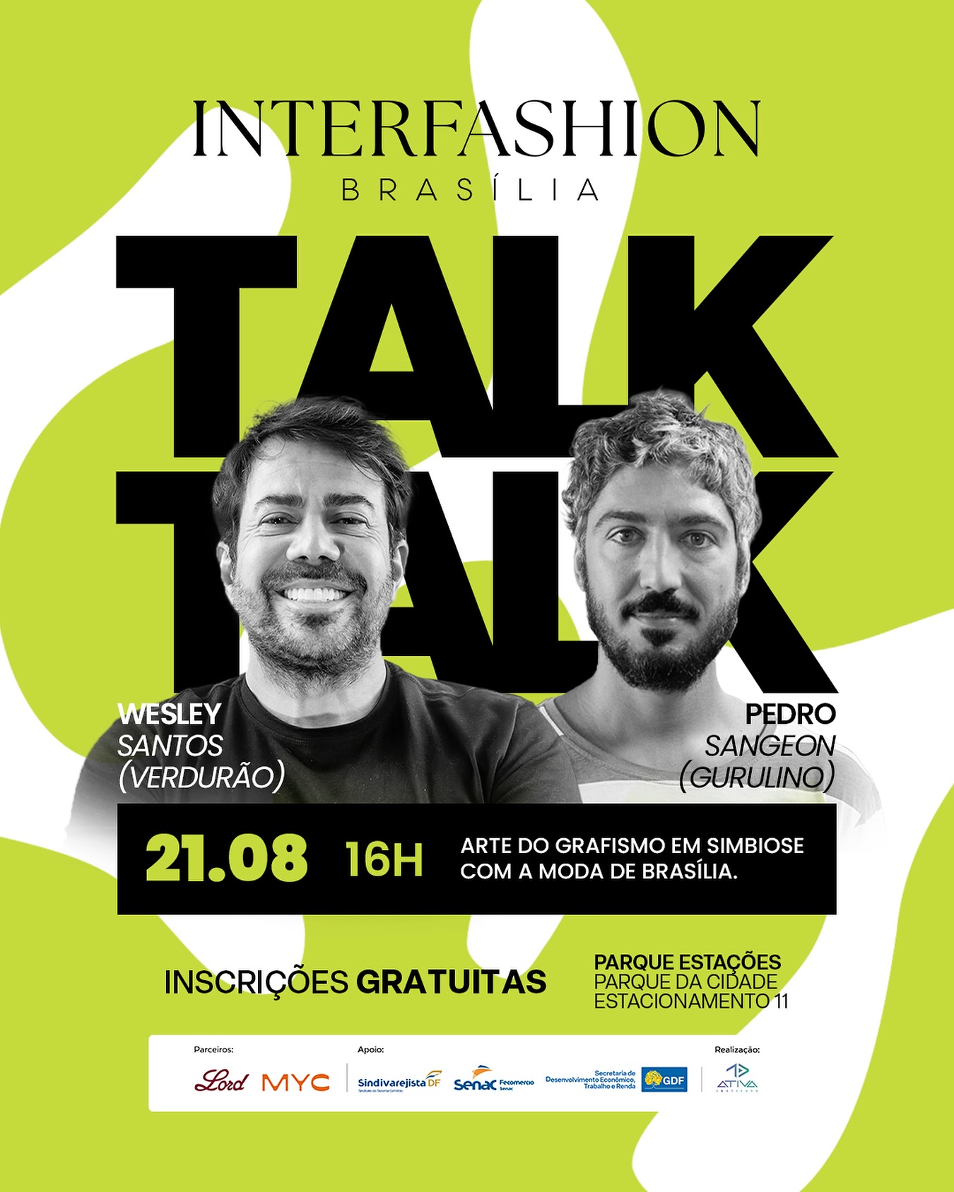 No dia 21/08, às 16h, teremos um Talk Talk especial com Wesley Santos (Verdurão) e Pedro Sangeon (Gurulino) sobre “A arte do grafismo em simbiose com a moda de Brasília”.