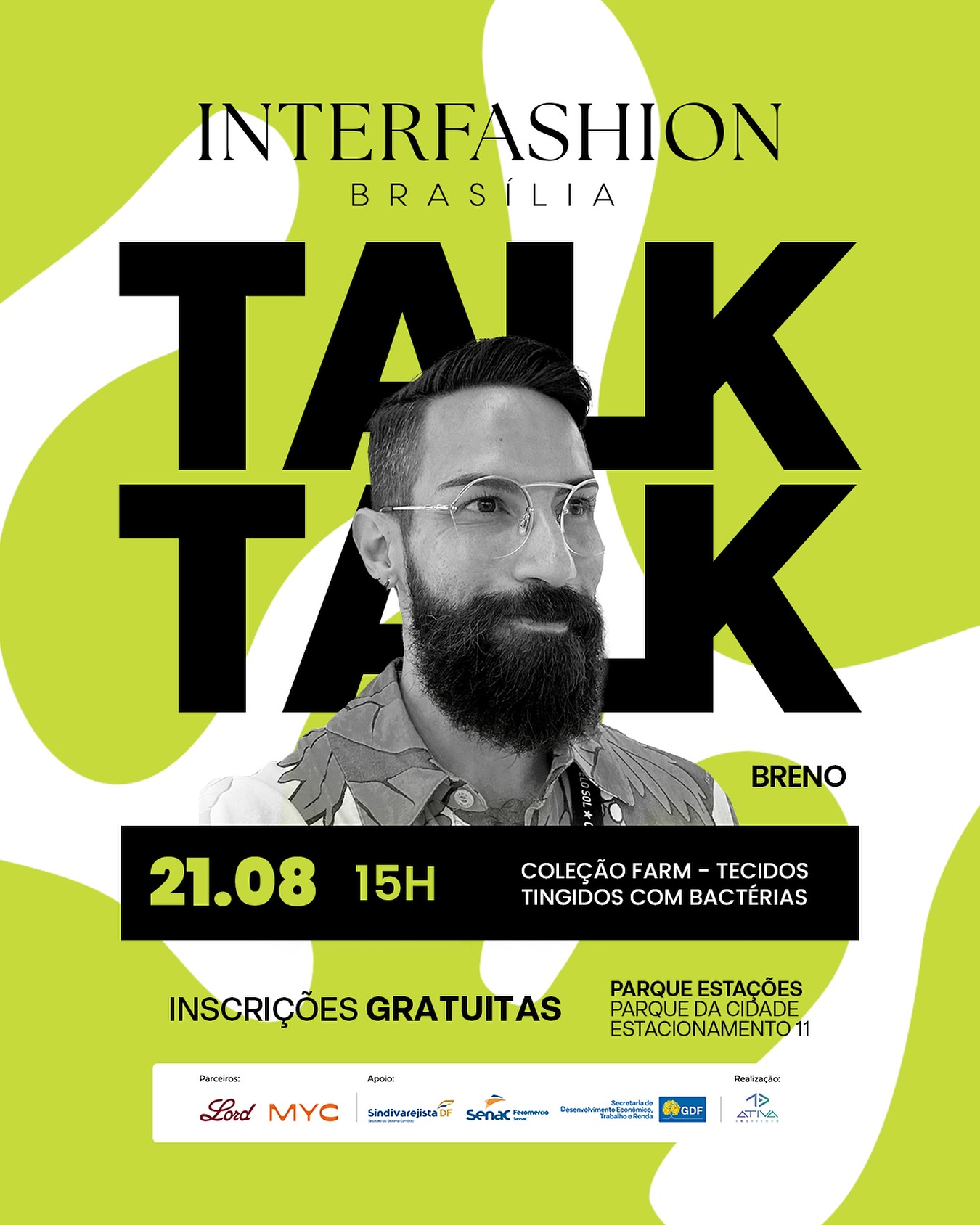 No dia 21/08, às 15h, Breno participa do Talk Talk apresentando a coleção FARM com tecidos tingidos com bactérias, um projeto que une moda, ciência e sustentabilidade para repensar o futuro da indústria.